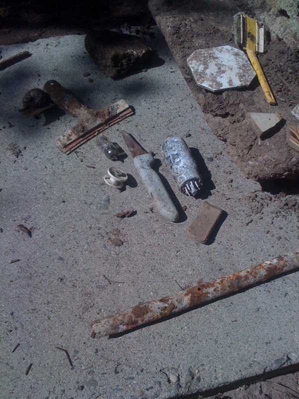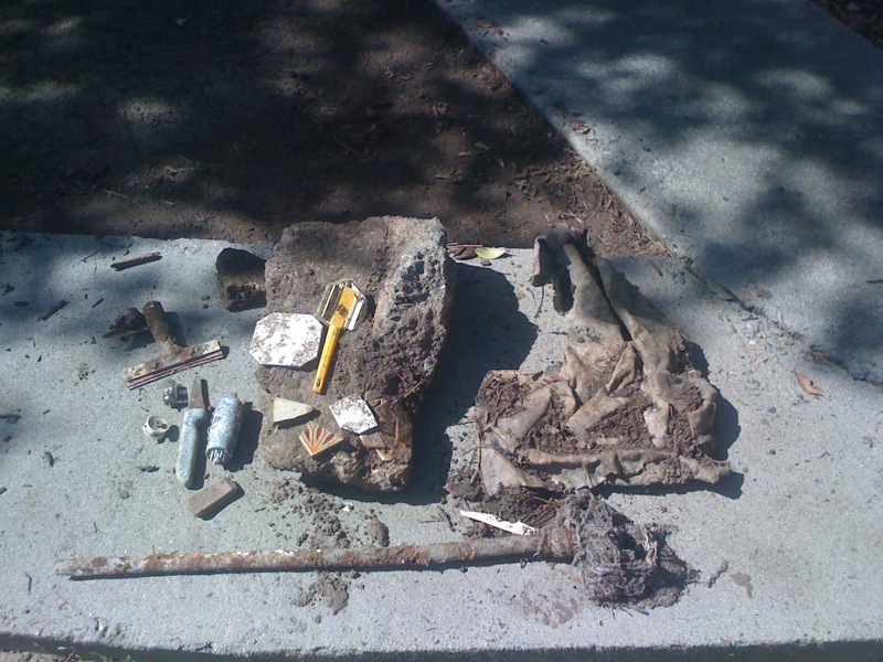 As I started preparing the area wher I am going to install a mosaic I discovered a treasure trove (is that one word or two?) of junk. It’s amazing what you can find just digging in your backyard; makes me wonder who lived here before and what were they doing? Among other things I found a mop, some broken tile, a hunk o’ cement, a knife, a squeegee, some vaccuum tubes, and an eraser. See for yourself: