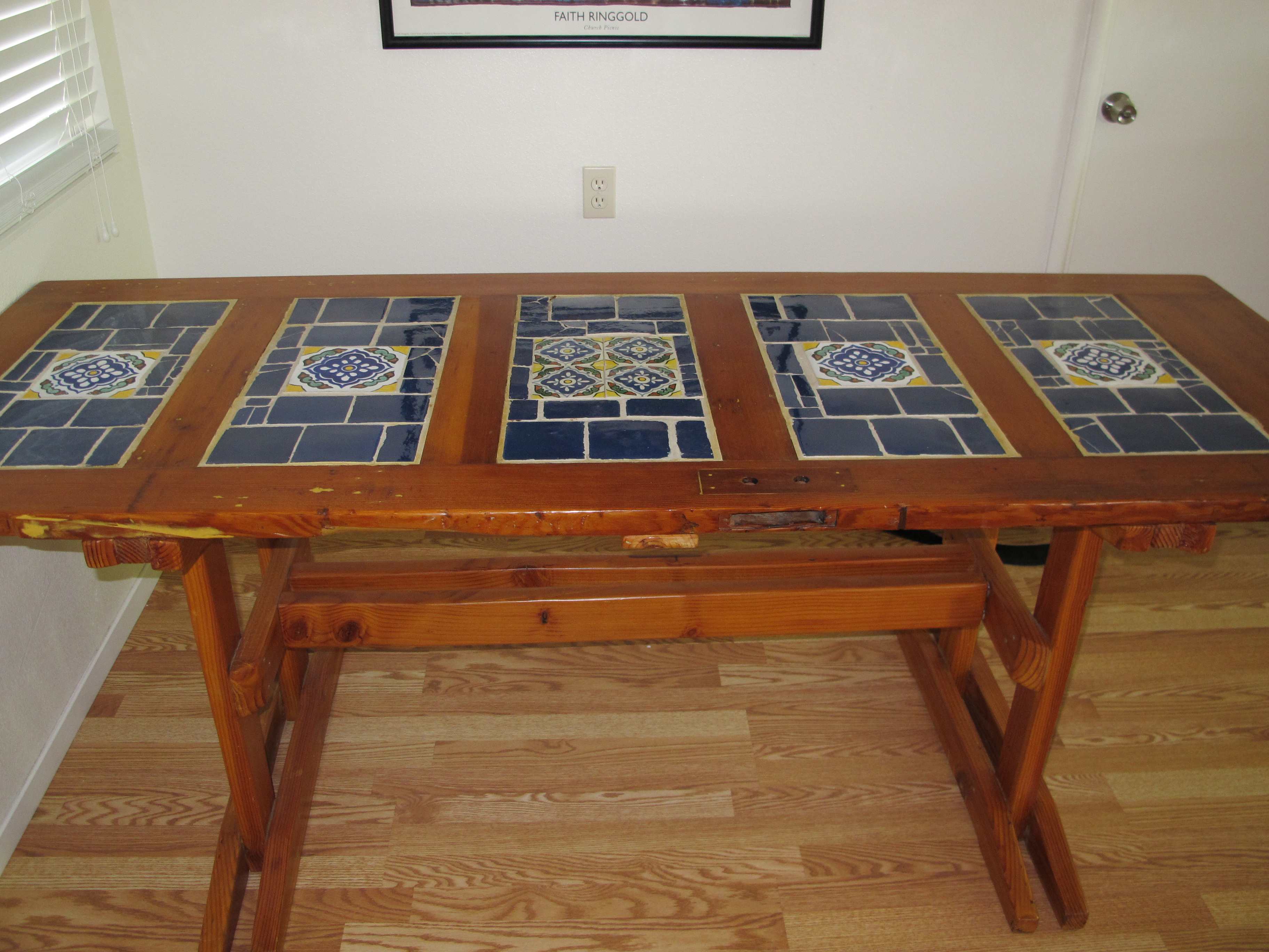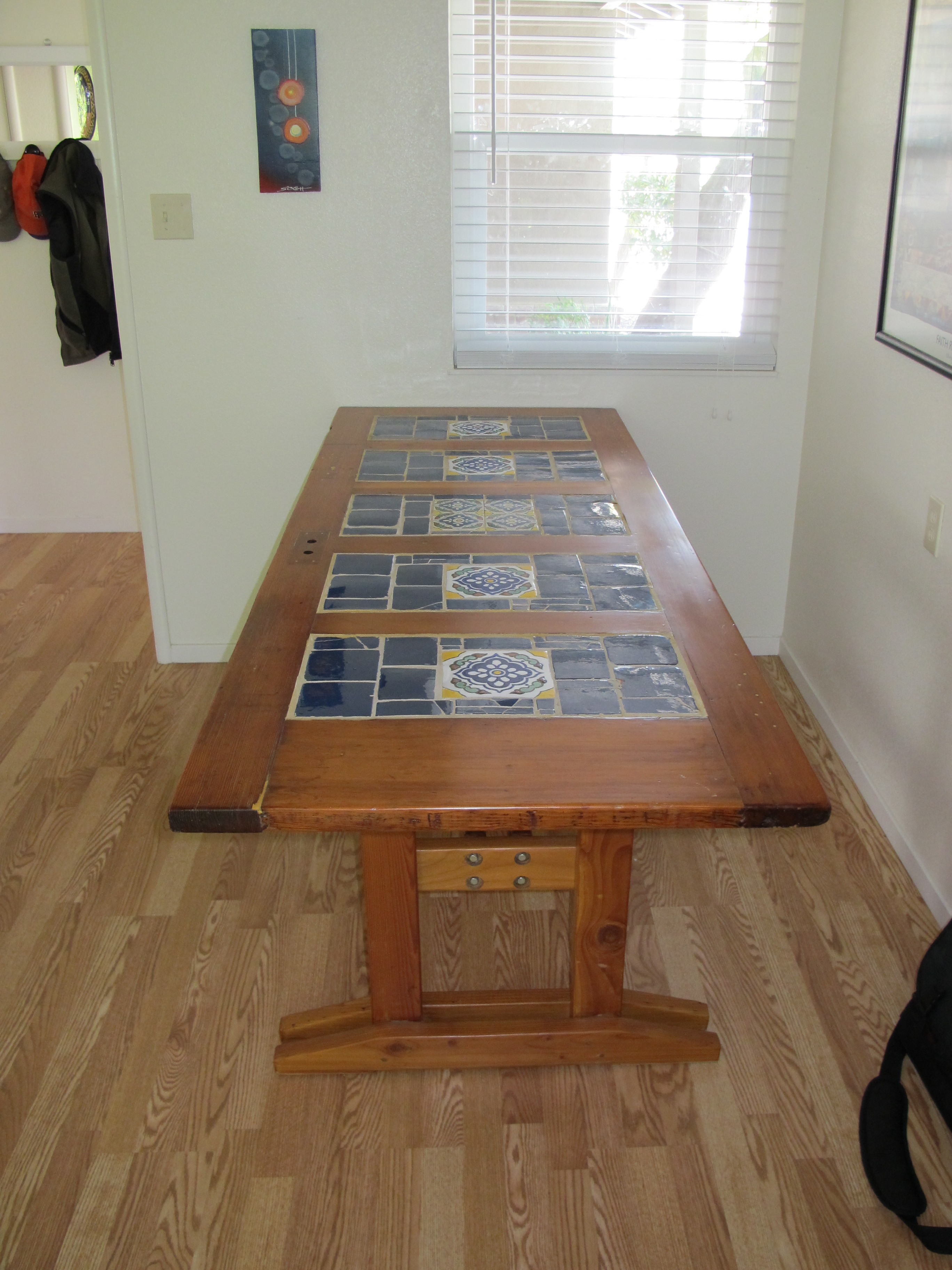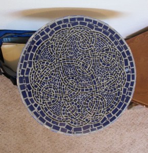 This is an end table with a Celtic knot tile mosaic. I cut down the tiles from regular 4 inch tiles, it was pretty tedious, but turned out alright.