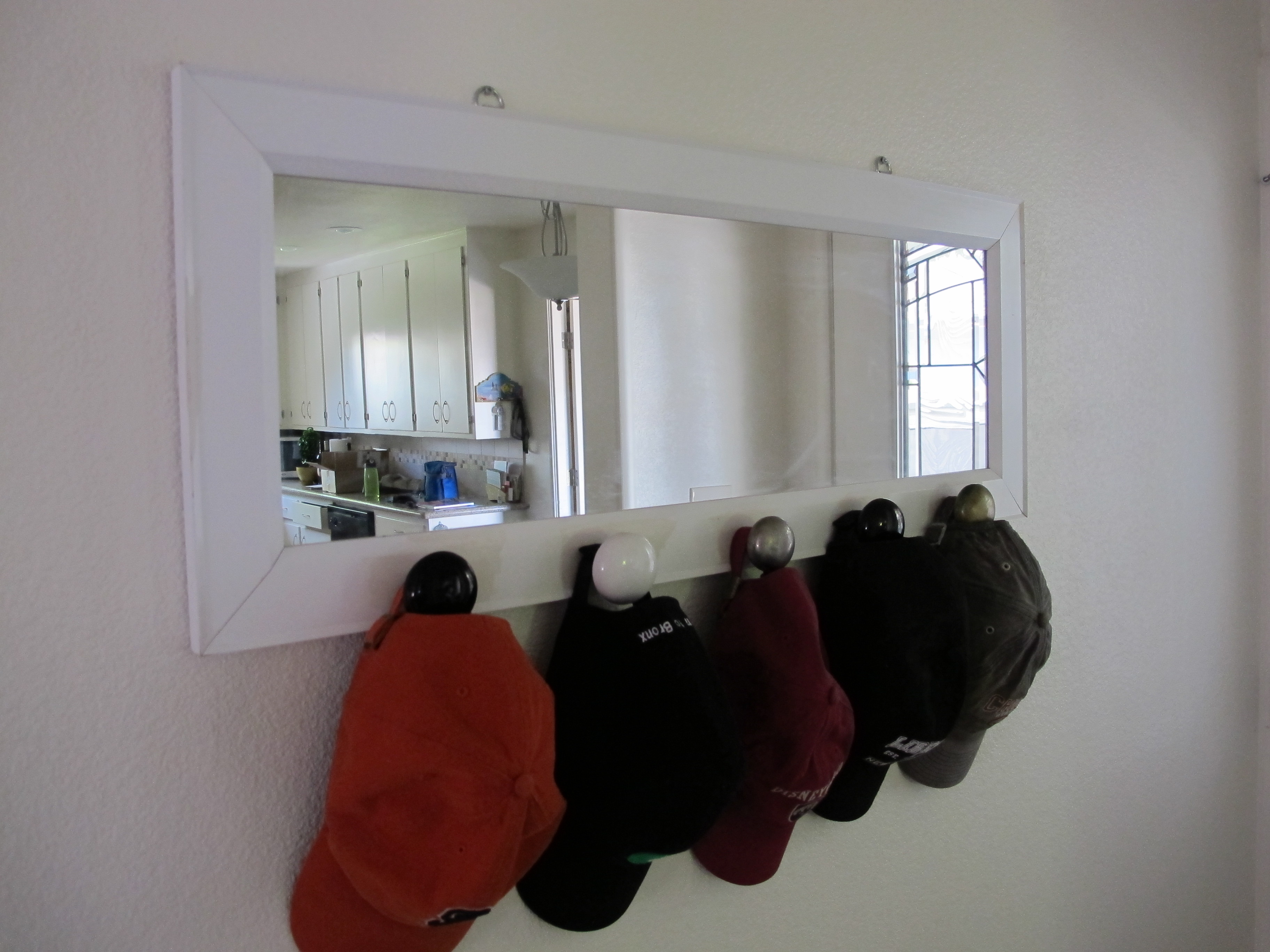 Bought this mirror at Target, it had hooks on it, I replaced them with antique doorknobs.