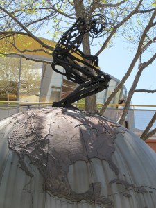 Being a geography nerd I said to myself, “AWESOME!” Then promptly ran down to check the sculpture out. On the way down I thought, “Hey, I bet this is on my Roadside America app.” Sho’ nuff it ’twas. The sculpture is called “Urge” and the dude on top is supposed to stand and sit in response to onlookers. He looks like this: