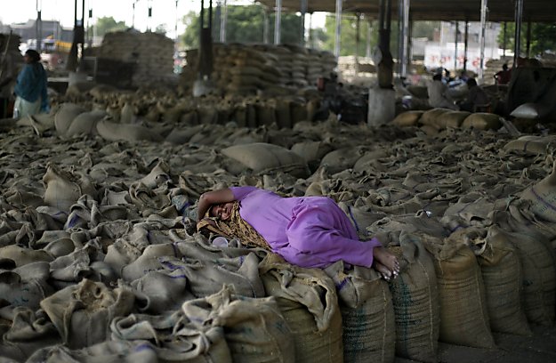Caption: In this photo taken Thursday, May 3, 2012, an Indian laborer sleeps on jute bags containing wheat grain at a grain market in Amritsar, India. Four bumper harvests over the past five years have swelled food grain production across the country. The government has been reluctant to allow grain exports for fear of political protests at a time when it has been dogged by double digit food inflation for months. Nearly half of India’s children under age five are malnourished. (AP Photo/Altaf Qadri)