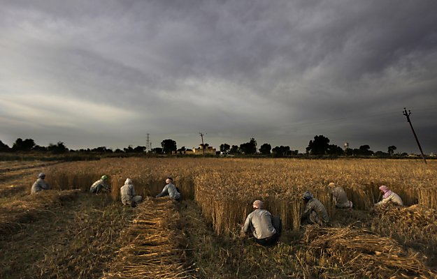 Caption: In this photo taken Tuesday, May 1, 2012, Indian farmers and migrant laborers harvest wheat crop on the outskirts of Amritsar, India. Four bumper harvests over the past five years have swelled food grain production across the country. The government has been reluctant to allow grain exports for fear of political protests at a time when it has been dogged by double digit food inflation for months. Nearly half of India’s children under age five are malnourished. (AP Photo/Altaf Qadri)