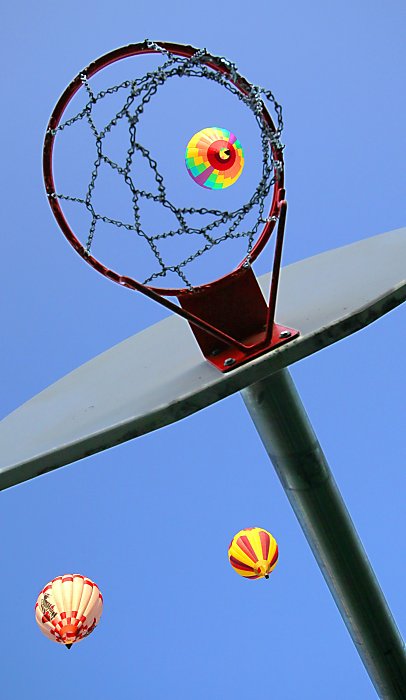Now I wonder, “What was this photographer thinking?”, when the picture was taken; I don’t mean that in the crazy way, like “That photographer was crazy for taking this picture”, I mean in the, “What was he pondering” way. How did he decide to frame the ballon this way; oh, and why are the balloons so near basketball hoops anyway? Don’t they usually launch and fly over wide open spaces?