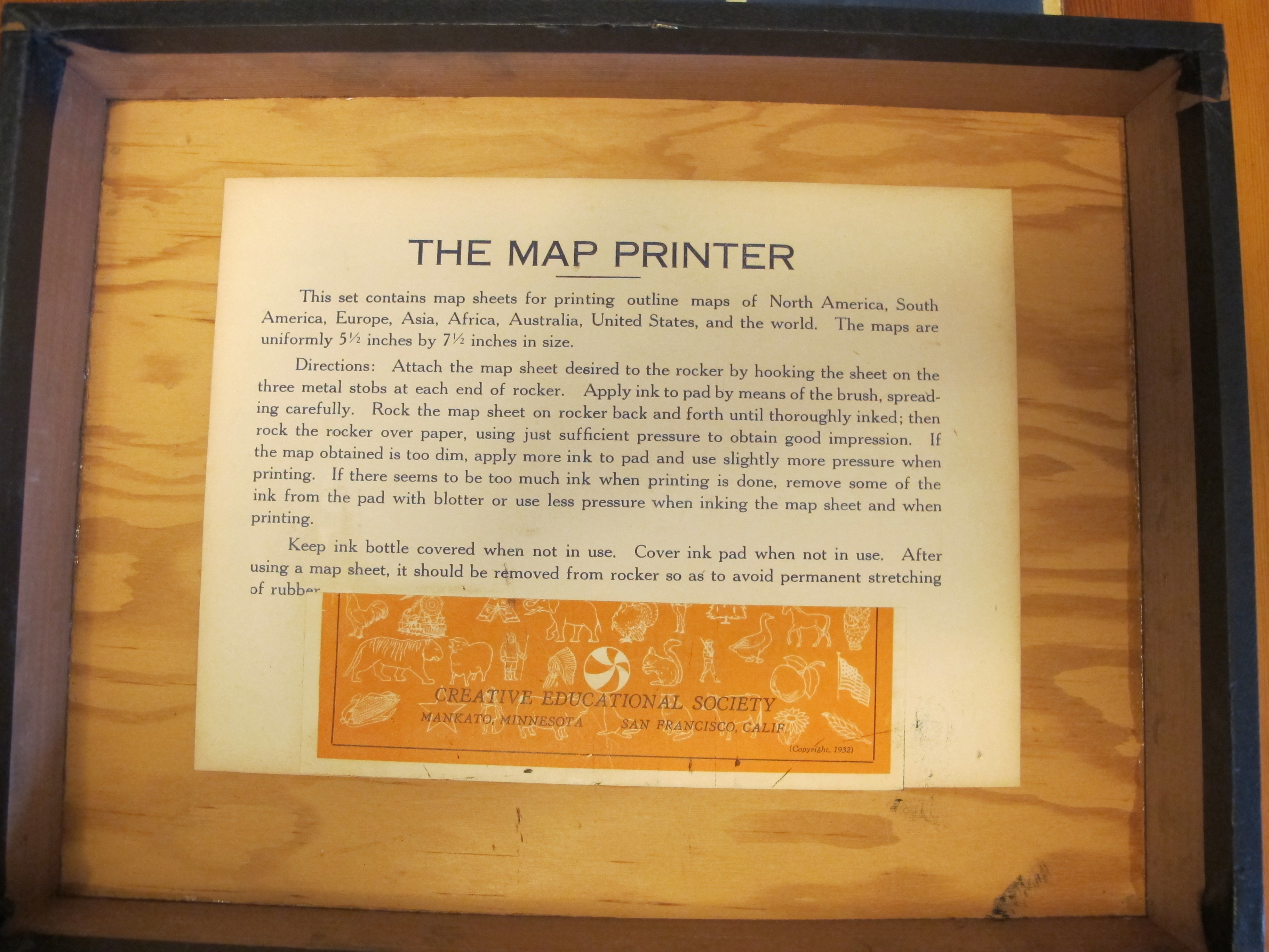 The box contains a large ink pad, a wooden roller with handle, and several rubber stamp maps. Not sure how old this is but the copyright is 1932; I’m not too surprised the ink pad is dry. I couldn’t find a replacement pad large enough so I had to improvise with a smaller one, but first I had to apply the stamp to the roller. I chose the Europe stamp, since I’m goin’ there n’ all.