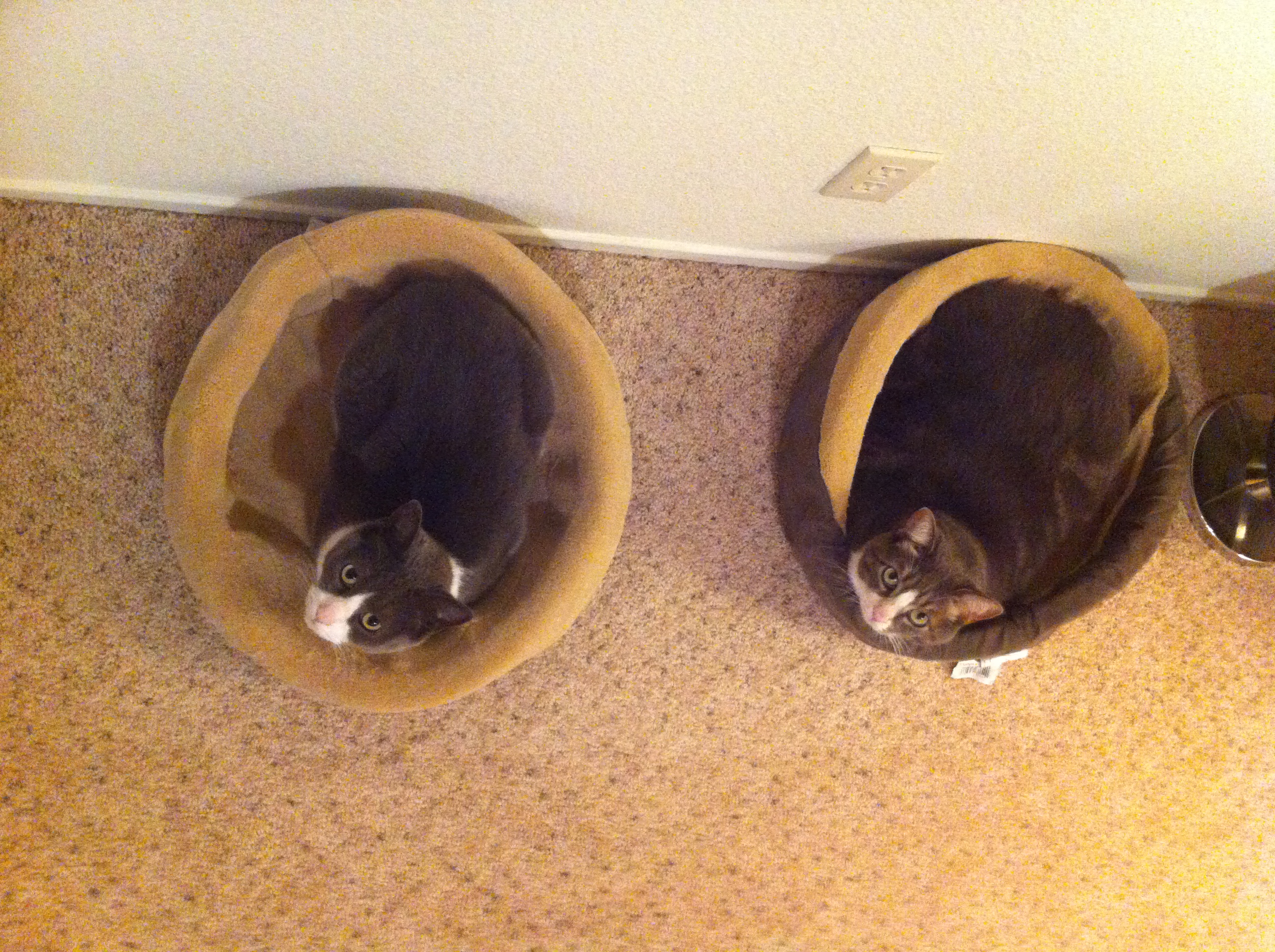 A week ago I took Fat Java to the vet to get to the bottom… of her using my carpet as TP. She officially weighs 19.1 pounds; that’s a lotta cat. The vet confirmed what I already knew, “She’s too fat to clean herself.” So he took her in the back to shave a bit of hair away to see if that would help; it hasn’t. I’m not sure if I have truly conveyed how large she really is so here is a comparison with Linux the “I like to be in high places and also act like I want you to pet me then run away” normal sized cat, and Fat Java in cat beds that are the same size: