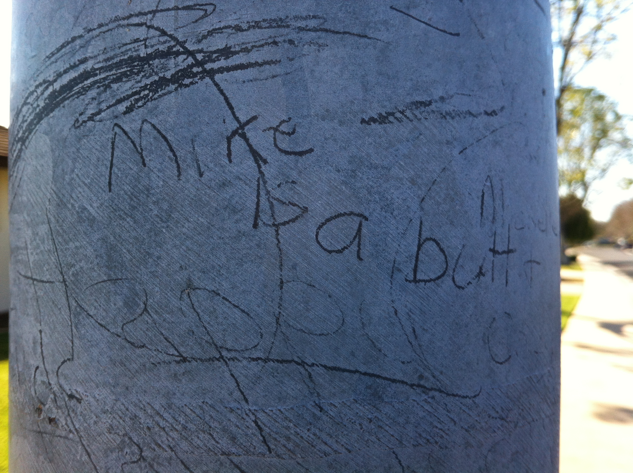 Thinking about that cartoon and running through my old neighborhood I was feeling the tug of youth, back to about the time I wouldn’t run the mile. My neighborhood was great. All the kids played together, hung out, did stupid things including writing on light poles. We wrote things like ‘so n’ so was here’, ‘Sally + Ronny’, ‘Jimmy smells’, etc. I wondered if what we wrote was still there. So this afternoon I went over to visit my folks and before leaving went out to the light pole by our driveway and took this: