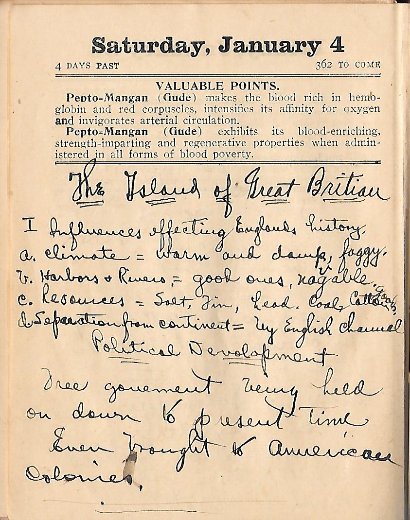 I immediately connected to the Jan. 4, 1908 entry regarding the history of England which discussed the “Island of Great Britain”. The notes Poppa took in whatever class he was taking or interest he was pursuing I could easily use today when teaching about the Industrial Revolution. The reason Great Britain was able to industrialize first was because it was geographically lucky: