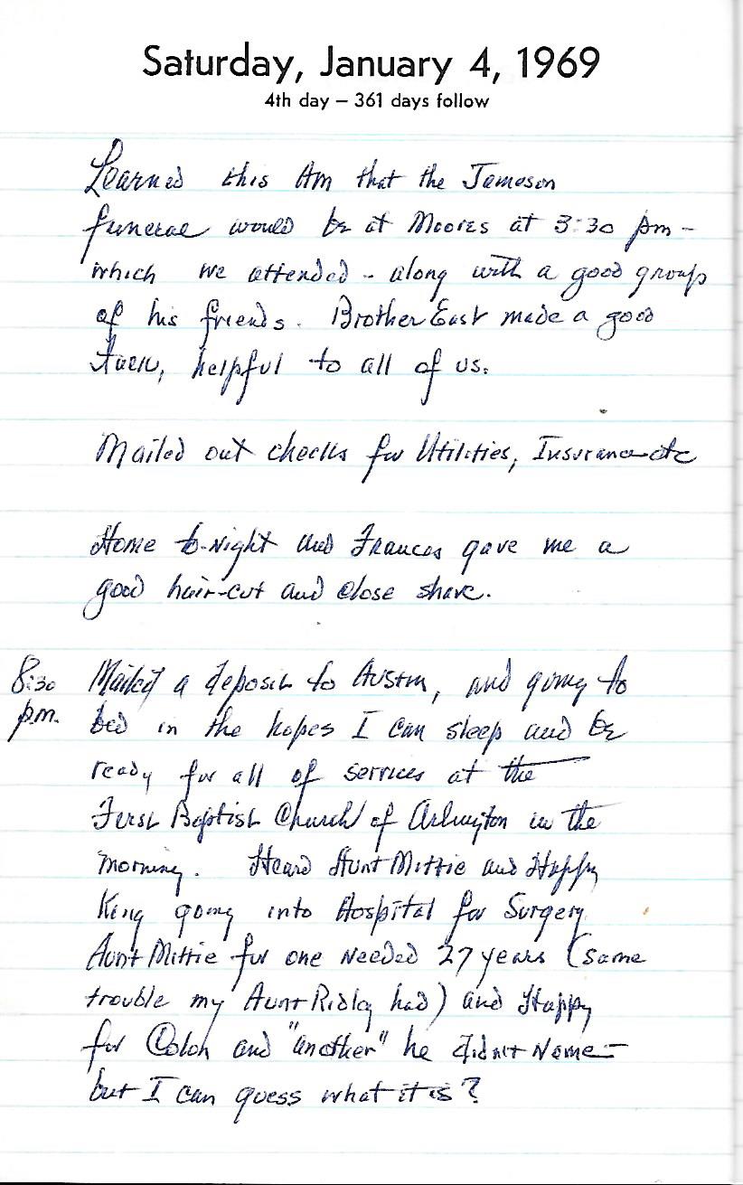 It was interesting to see that Poppa’s friend that passed the day before was having a funeral the day after. These days it seems such ceremonies have at least a few days in between. I can picture Mimi giving him that good-haircut and close shave. Who was Happy King? I know I have a relative named King Coke; really. And what were the ailments he(?) and Aunt Mittie needed? Apparently Mittie had been ignoring her ailment for 27 years.