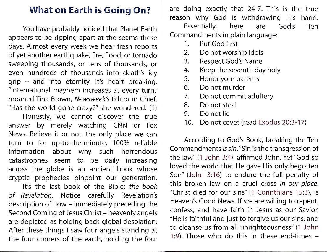 I was a little disappointed that I wasn’t home to educate the solicitor who dropped this pamphlet off about plate tectonics, meteorology and climatology. Then I began to wonder, “How, in 2015, in a developed country can someone not know what causes earthquakes?” (I do give this organization credit; the design of the pamphlet is clever.) Not to denigrate someone’s religious beliefs but there are any number of scientists who are able to reconcile their strong faiths with science.