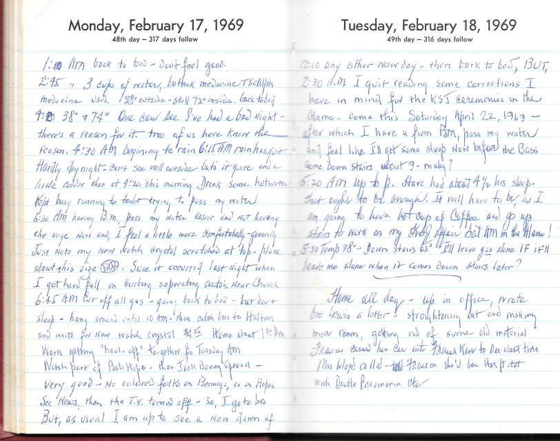 Peering into someone else’s life through the thoughts they chose to write down is at once both fascinating and challenging. For instance, why did his buttock need medicine? Also while he seems to be fairly free in his writing, meaning doesn’t seem to be much that’s off limits, I wonder why he doesn’t state what is keeping him up only that, “…two of us know the reason.” I’m appreciating his notations about the weather that is also something my Dad was obsessed with. I do think he could have done a better job of sketching his damaged watch crystal, what he drew just looks like squiggles. I wonder how often he had to get ‘haul offs’ ready. That reminds me of the annual purges of junk from the garage my Dad subjected us to. He was always cleaning out closets, drawers and throwing stuff out…then replacing what he threw away because he’d forgotten he tossed it! My dad would also hide presents prior to birthdays and Christmas. Every Christmas in the “present coma” invariably my Dad would survey the scene of giftwrap carcasses and glut of gifts and say, “I think there’s something missing.” At that point he’d disappear into the garage or some closet in the house, and return with a gift for one of us he’d forgotten he hid. He was also famous for hitting the after Christmas sales looking for deals on holiday paraphernalia. One year he found a great deal on a fake tree that was pre-strung with lights, brought it home opened the closet in the garage to store it for the following year only to find a very similar box with a similar tree inside from the previous year!