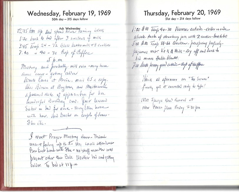 I just realized, or more accurately remembered, that my Dad had many bouts of insomnia. I remember often waking up early and finding him either sitting in a chair reading or asleep in a chair with a book on his lap. The weather seems to be getting worse though I don’t understand his temperature records. I mean on the 20th he writes, “Temp 40 -70 Warmer outside – colder inside”, does that mean it was 70 degrees outside and 40 inside? Looks like his speech is almost ready!