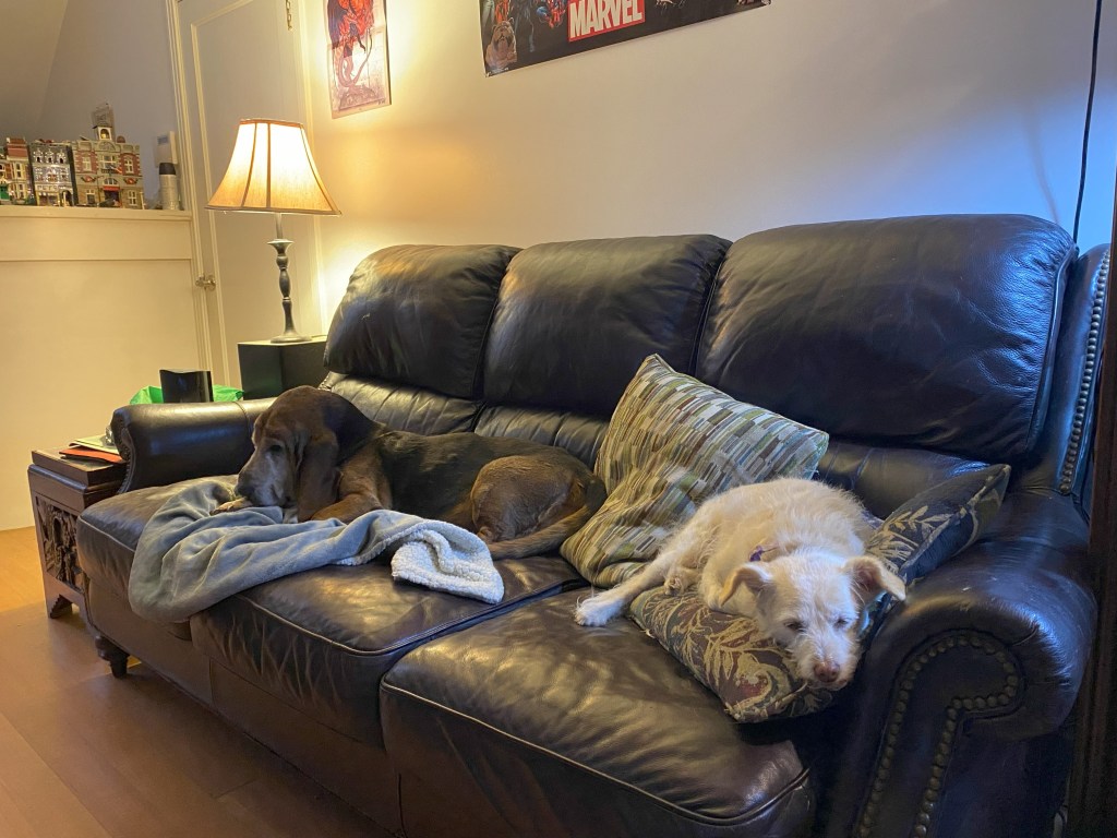 Left to right: Wallace a geriatric Bassett Hound, Arwen some kind of terrier (?) of indeterminate age- at least I don’t know how old she is, and Colson a cat. All of them were easy, friendly though Wallace drank incessantly and Arwen has “little spastic dog syndrome”, she loves you but is terrified of you as well.