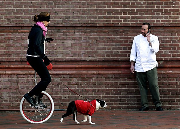 Lisa Polinori, left, walks her Boston Terrier, “Enzodog,” while riding a unicycle in Baltimore, Tuesday, March 6, 2012.